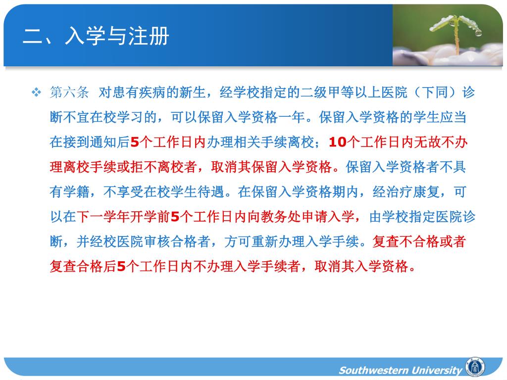二、入学与注册 • 第六条 对患有疾病的新生,经学校指定的二级甲等以上医院(下同)诊断不宜在校学习的,可以保留入学资格一年。保留入学资格的学生应当在接到通知后5个工作日内办理相关手续离校;10个工作日内无故不办理离校手续或拒不离校者,取消其保留入学资格。保留入学资格者不具有学籍,不享受在校学生待遇。在保留入学资格期内,经治疗康复,可以在下一学年开学前5个工作日内向教务处申请入学,由学校指定医院诊断,并经校医院审核合格者,方可重新办理入学手续。复查不合格或者复查合格后5个工作日内不办理入学手续者,取消其入学资格。 Southwestern University