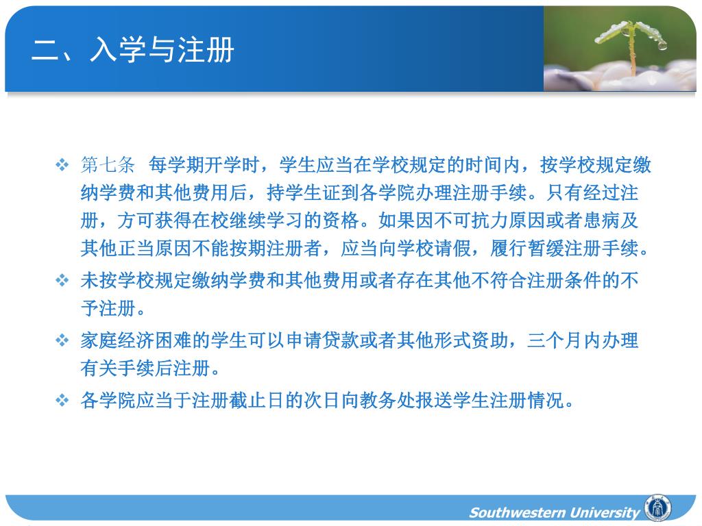 二、入学与注册 • 第七条 每学期开学时,学生应当在学校规定的时间内,按学校规定缴纳学费和其他费用后,持学生证到各学院办理注册手续。只有经过注册,方可获得在校继续学习的资格。如果因不可抗力原因或者患病及其他正当原因不能按期注册者,应当向学校请假,履行暂缓注册手续。 • 未按学校规定缴纳学费和其他费用或者存在其他不符合注册条件的不予注册。 • 家庭经济困难的学生可以申请贷款或者其他形式资助,三个月内办理有关手续后注册。 • 各学院应当于注册截止日的次日向教务处报送学生注册情况。 Southwestern University