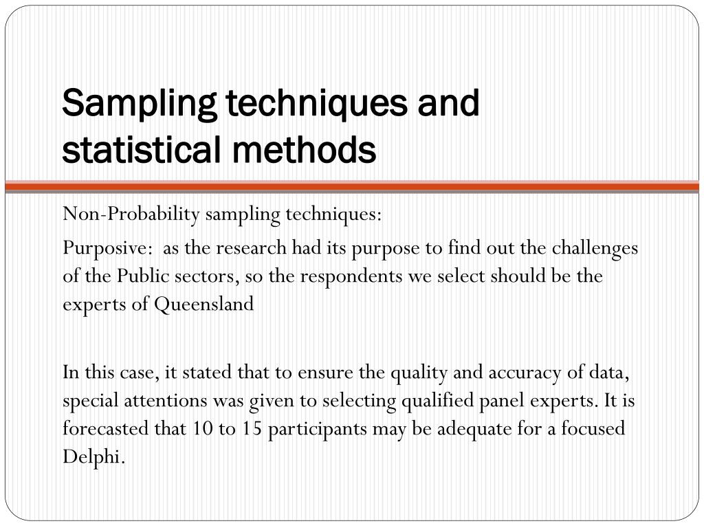 Sampling techniques and statistical methods Non-Probability sampling techniques: Purposive: as the research had its purpose to find out the challenges of the Public sectors, so the respondents we select should be the experts of Queensland In this case, it stated that to ensure the quality and accuracy of data, special attentions was given to selecting qualified panel experts. It is forecasted that 10 to 15 participants may be adequate for a focused Delphi.