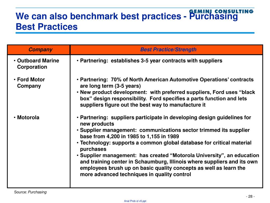 We can also benchmark best practices - Purchasing Best Practices • Company Best Practice/Strength • Outboard Marine Corporation • Ford Motor Company • Motorola • Partnering: establishes 3-5 year contracts with suppliers • Partnering: 70% of North American Automotive Operations’ contracts are long term (3-5 years) • New product development: with preferred suppliers, Ford uses “black box” design responsibility. Ford specifies a parts function and lets suppliers figure out the best way to manufacture it • Partnering: suppliers participate in developing design guidelines for new products • Supplier management: communications sector trimmed its supplier base from 4,200 in 1985 to 1,155 in 1989 • Technology: supports a common global database for critical material purchases • Supplier management: has created “Motorola University”, an education and training center in Schaumburg, Illinois where suppliers and its own employees brush up on basic quality concepts as well as learn the more advanced techniques in quality control Source: Purchasing