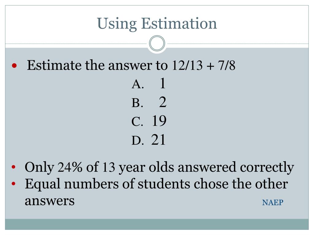 Using Estimation • Estimate the answer to 12/13 + 7/8 • 1 • 2 • 19 • 21 • Only 24% of 13 year olds answered correctly • Equal numbers of students chose the other answers NAEP