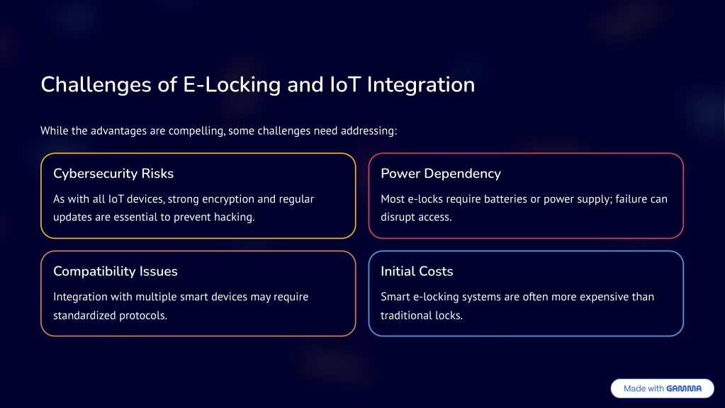 Challenges of E-Locking and IoT Integration While the advantages are compelling, some challenges need addressing: Cybersecurity Risks Power Dependency As with all IoT devices, strong encryption and regular updates are essential to prevent hacking. Most e-locks require batteries or power supply; failure can disrupt access. Compatibility Issues Initial Costs Integration with multiple smart devices may require standardized protocols. Smart e-locking systems are often more expensive than traditional locks.