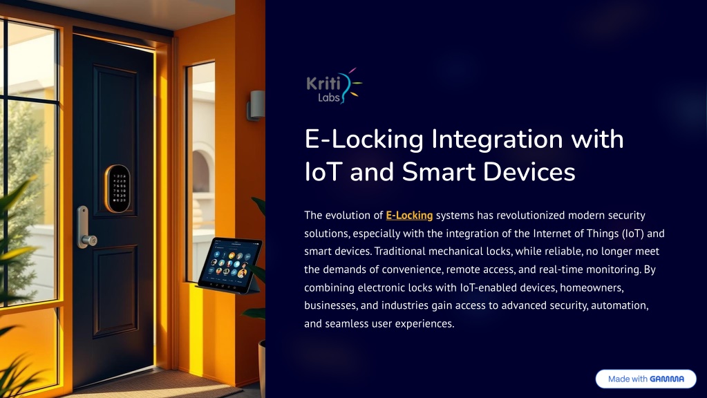 Final Thoughts The integration of E-Locking with IoT and smart devices represents a significant leap in security, convenience, and efficiency. From homes to enterprises, these systems provide remote control, real-time monitoring, and flexible access management. However, users must balance the benefits with considerations of cybersecurity and cost. As IoT continues to evolve, e-locking will play an increasingly vital role in shaping smarter, safer living and working environments. Contact us: Website: https://www.kritilabs.com/ Email: contact@kritilabs.com Location: Thiruvanmiyur, Chennai 3 600 041, Tamil Nadu, India.