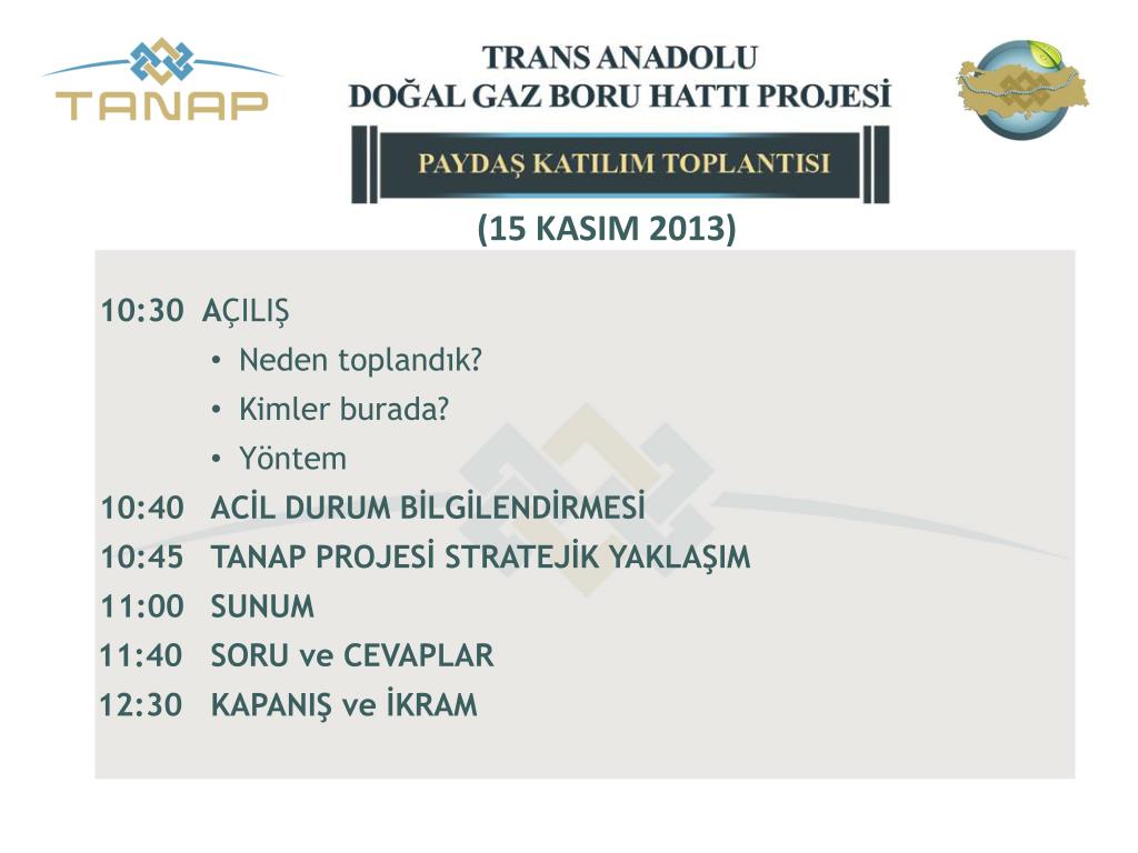 (15 KASIM 2013) 10:30 AÇILIŞ • Neden toplandık? • Kimler burada? • Yöntem 10:40 ACİL DURUM BİLGİLENDİRMESİ 10:45 TANAP PROJESİ STRATEJİK YAKLAŞIM 11:00 SUNUM 11:40 SORU ve CEVAPLAR 12:30 KAPANIŞ ve İKRAM