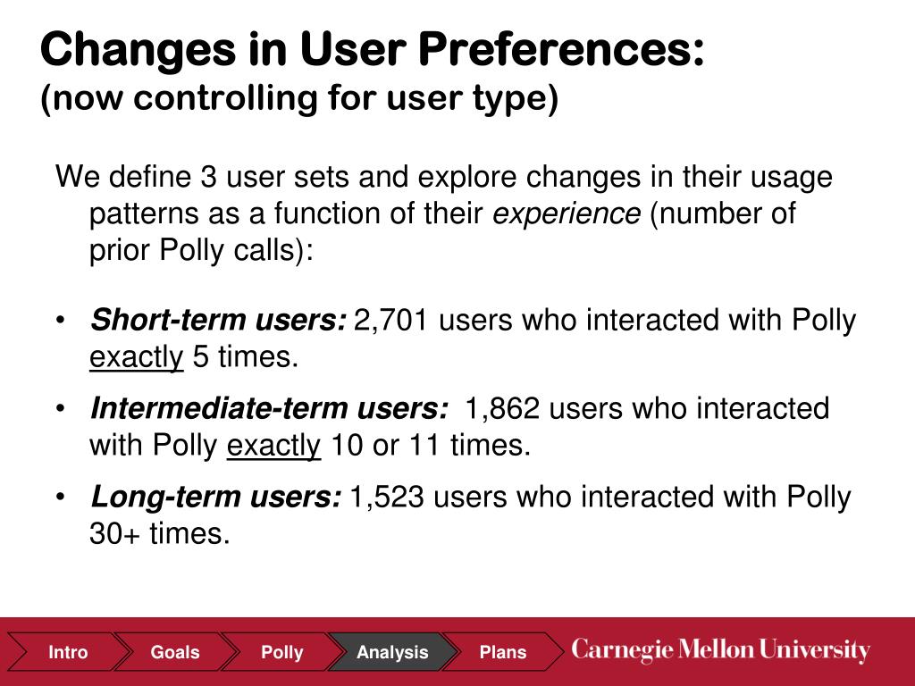 Changes in User Preferences:(now controlling for user type) • We define 3 user sets and explore changes in their usage patterns as a function of their experience(number of prior Polly calls): • Short-term users: 2,701 users who interacted with Polly exactly5 times. • Intermediate-term users: 1,862 users who interacted with Polly exactly 10 or 11 times. • Long-term users: 1,523 users who interacted with Polly 30+ times. Intro Goals Polly Analysis Plans