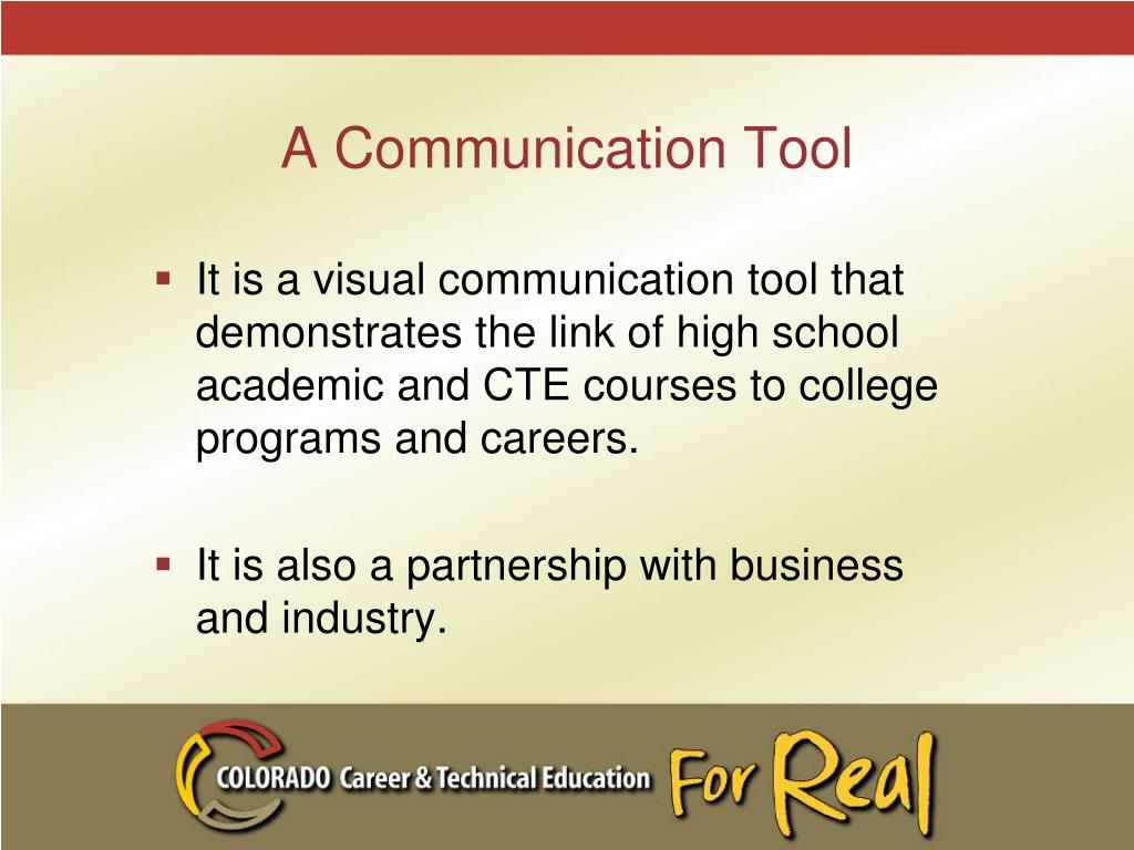 A Communication Tool • It is a visual communication tool that demonstrates the link of high school academic and CTE courses to college programs and careers. • It is also a partnership with business and industry.