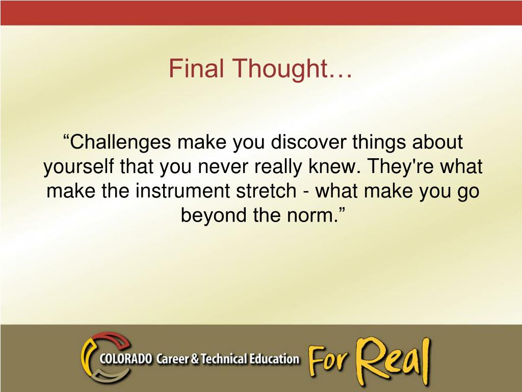 Final Thought… “Challenges make you discover things about yourself that you never really knew. They're what make the instrument stretch - what make you go beyond the norm.”