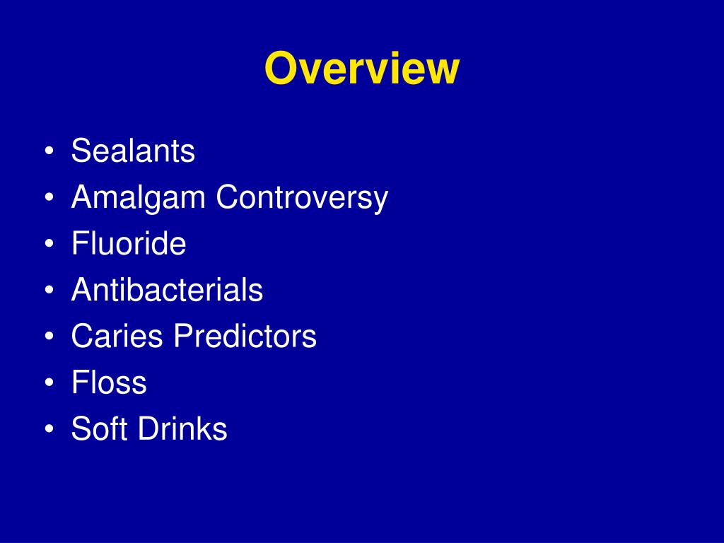Overview • Sealants • Amalgam Controversy • Fluoride • Antibacterials • Caries Predictors • Floss • Soft Drinks