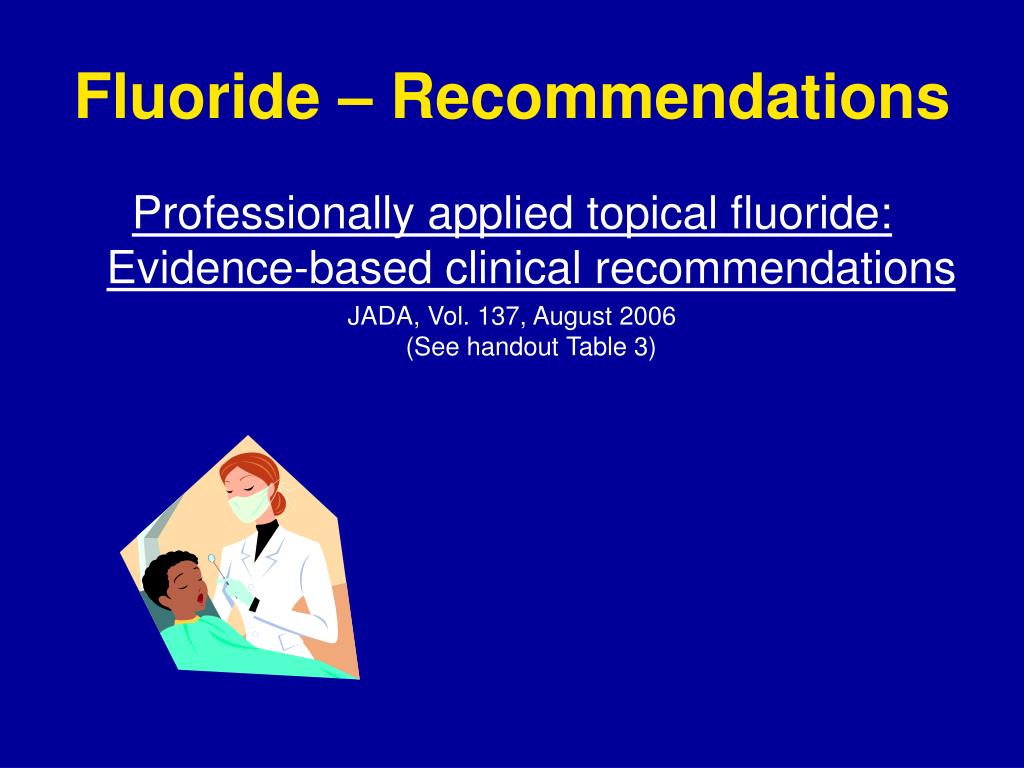 Fluoride – Recommendations Professionally applied topical fluoride: Evidence-based clinical recommendations JADA, Vol. 137, August 2006(See handout Table 3)