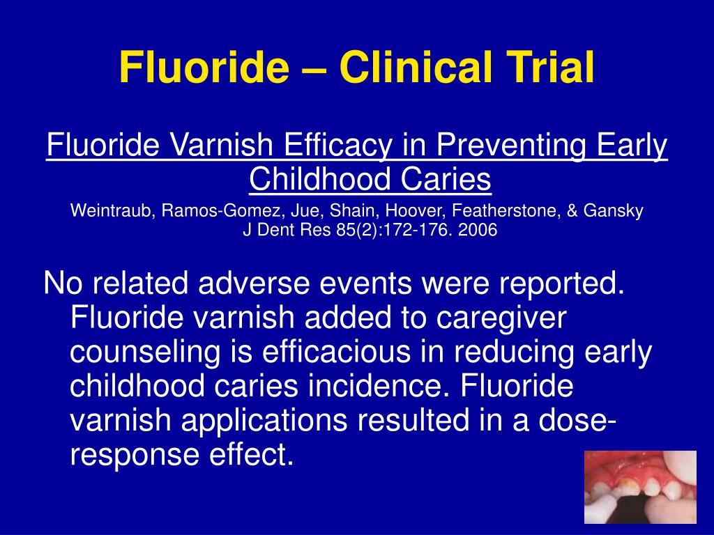 Fluoride – Clinical Trial Fluoride Varnish Efficacy in Preventing Early Childhood Caries Weintraub, Ramos-Gomez, Jue, Shain, Hoover, Featherstone, & GanskyJ Dent Res 85(2):172-176. 2006 No related adverse events were reported. Fluoride varnish added to caregiver counseling is efficacious in reducing early childhood caries incidence. Fluoride varnish applications resulted in a dose-response effect.