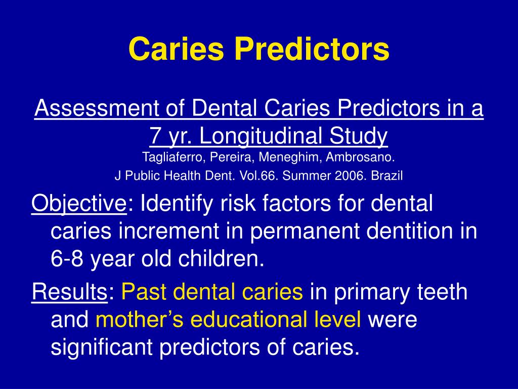 Caries Predictors Assessment of Dental Caries Predictors in a 7 yr. Longitudinal StudyTagliaferro, Pereira, Meneghim, Ambrosano. J Public Health Dent. Vol.66. Summer 2006. Brazil Objective: Identify risk factors for dental caries increment in permanent dentition in 6-8 year old children. Results: Past dental caries in primary teeth and mother’s educational level were significant predictors of caries.