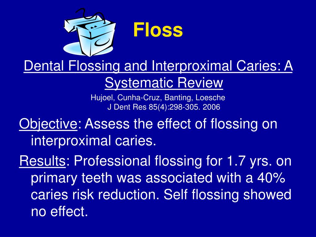 Floss Dental Flossing and Interproximal Caries: A Systematic Review Hujoel, Cunha-Cruz, Banting, LoescheJ Dent Res 85(4):298-305. 2006 Objective: Assess the effect of flossing on interproximal caries. Results: Professional flossing for 1.7 yrs. on primary teeth was associated with a 40% caries risk reduction. Self flossing showed no effect.