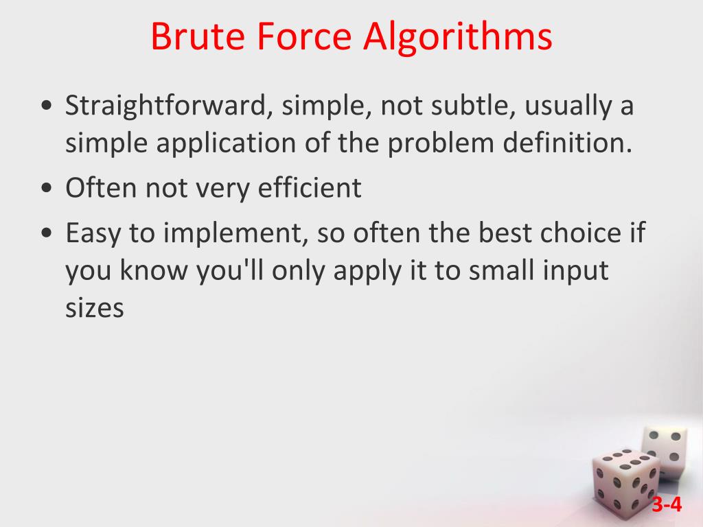 Brute Force Algorithms • Straightforward, simple, not subtle, usually a simple application of the problem definition. • Often not very efficient • Easy to implement, so often the best choice if you know you'll only apply it to small input sizes 3-4