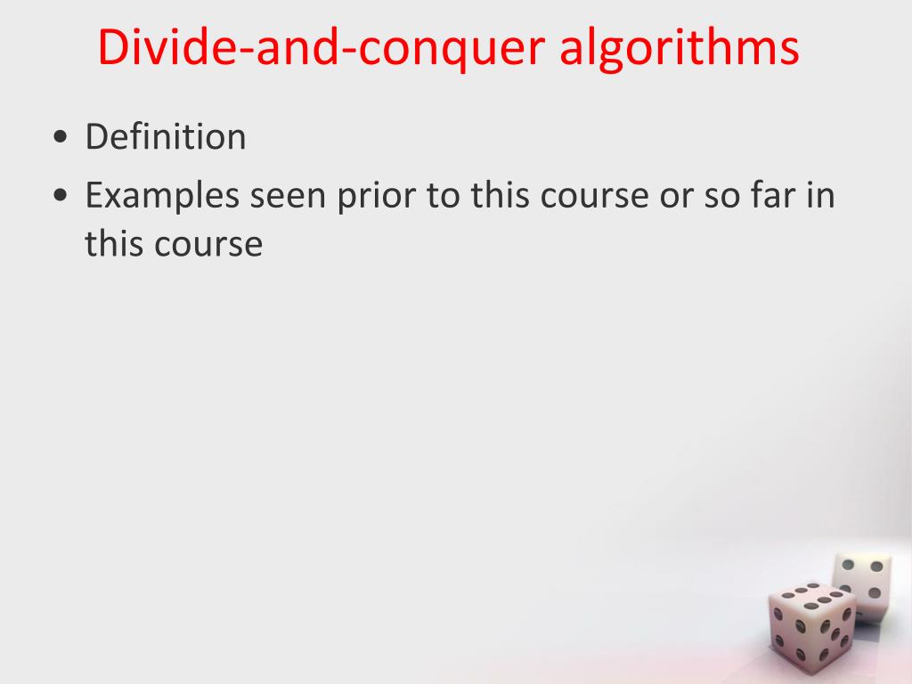 Divide-and-conquer algorithms • Definition • Examples seen prior to this course or so far in this course