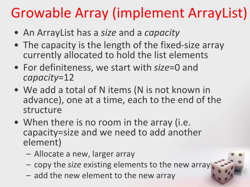 Growable Array (implement ArrayList) • An ArrayList has a size and a capacity • The capacity is the length of the fixed-size array currently allocated to hold the list elements • For definiteness, we start with size=0 and capacity=12 • We add a total of N items (N is not known in advance), one at a time, each to the end of the structure • When there is no room in the array (i.e. capacity=size and we need to add another element) • Allocate a new, larger array • copy the size existing elements to the new array • add the new element to the new array