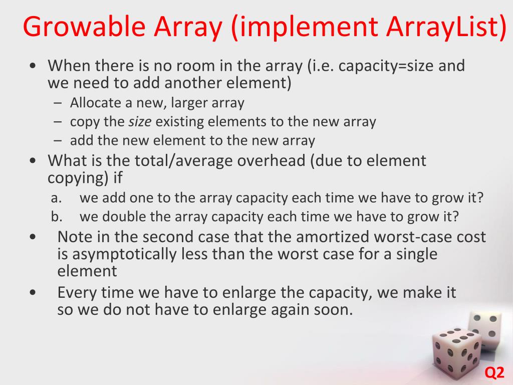 Growable Array (implement ArrayList) • When there is no room in the array (i.e. capacity=size and we need to add another element) • Allocate a new, larger array • copy the size existing elements to the new array • add the new element to the new array • What is the total/average overhead (due to element copying) if • we add one to the array capacity each time we have to grow it? • we double the array capacity each time we have to grow it? • Note in the second case that the amortized worst-case cost is asymptotically less than the worst case for a single element • Every time we have to enlarge the capacity, we make it so we do not have to enlarge again soon. Q2