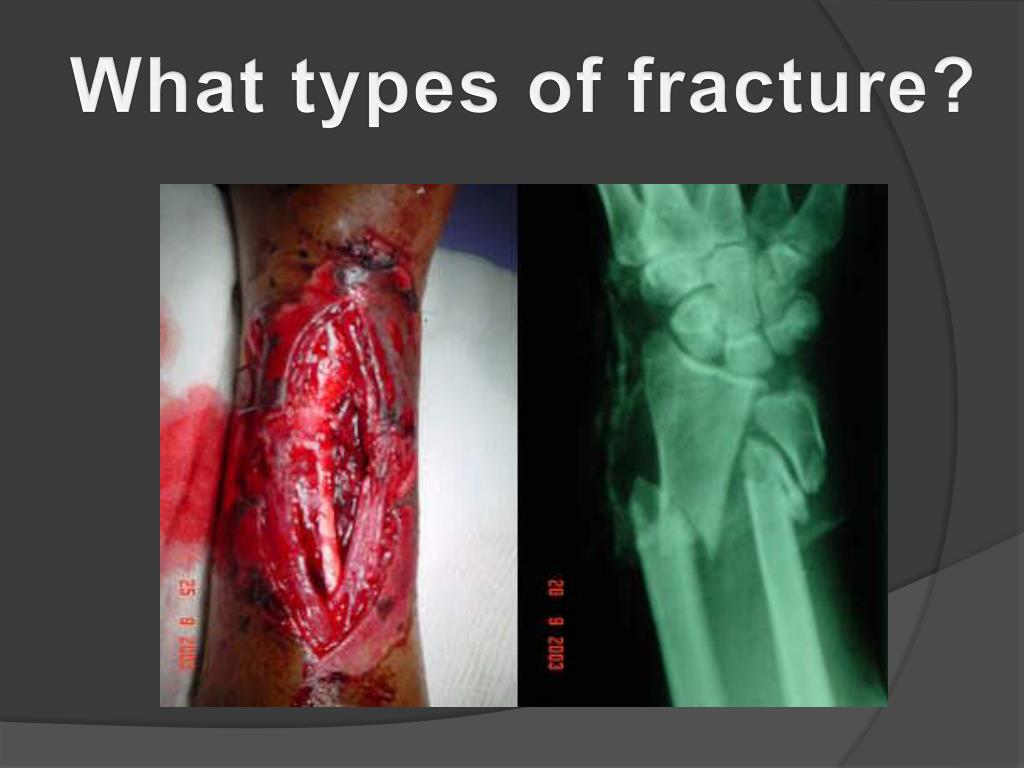Classifying Fractures • Open - where there is a wound exposing the fracture site, or the bone is protruding from the skin. • Closed - where the bone has fractured but has no obvious external wound. • Complicated - which may involve damage to associated vital organs and major blood vessels as a result of the fracture.