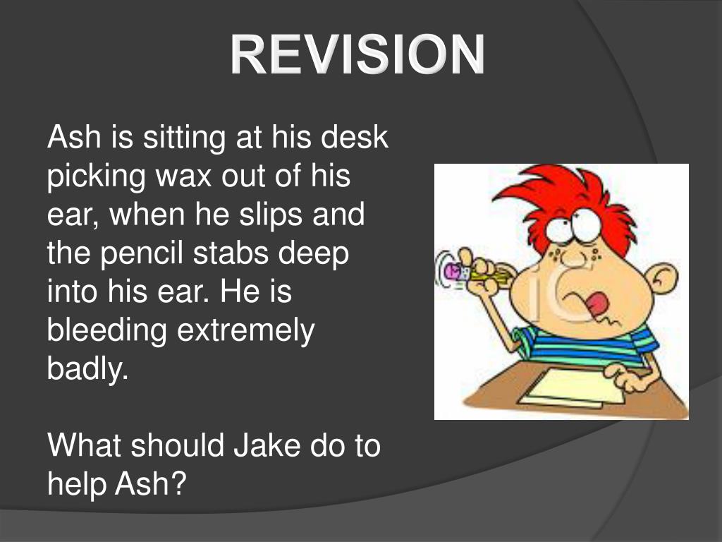 REVISION Ash is sitting at his desk picking wax out of his ear, when he slips and the pencil stabs deep into his ear. He is bleeding extremely badly. What should Jake do to help Ash?
