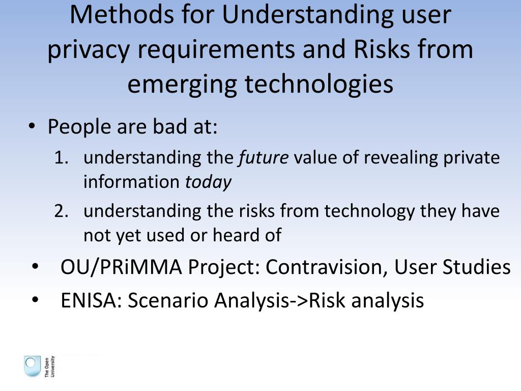 Methods for Understanding user privacy requirements and Risks from emerging technologies • People are bad at: • understanding the future value of revealing private information today • understanding the risks from technology they have not yet used or heard of • OU/PRiMMA Project: Contravision, User Studies • ENISA: Scenario Analysis->Risk analysis