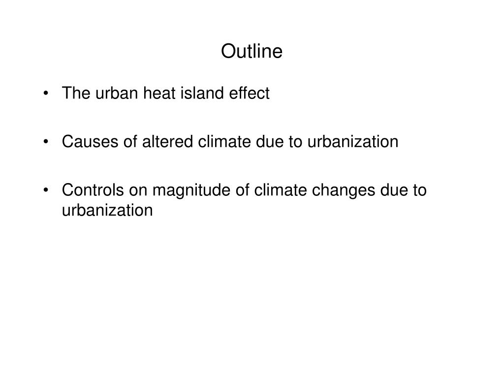 Outline • The urban heat island effect • Causes of altered climate due to urbanization • Controls on magnitude of climate changes due to urbanization