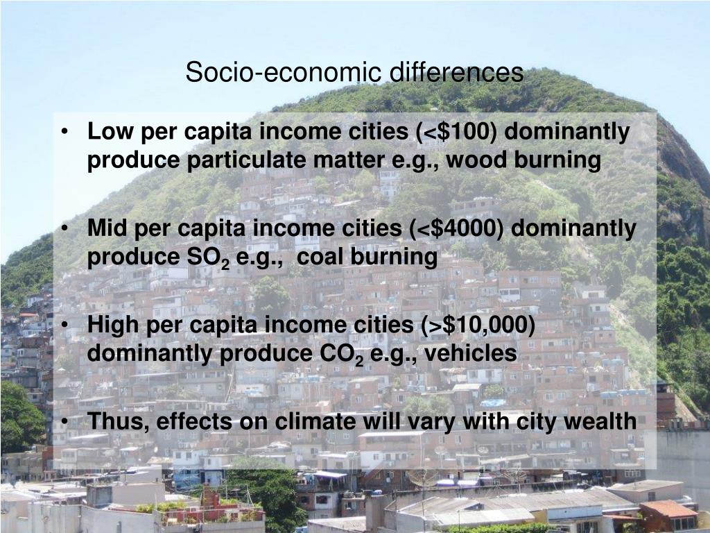 Socio-economic differences • Low per capita income cities (<$100) dominantly produce particulate matter e.g., wood burning • Mid per capita income cities (<$4000) dominantly produce SO2 e.g., coal burning • High per capita income cities (>$10,000) dominantly produce CO2 e.g., vehicles • Thus, effects on climate will vary with city wealth