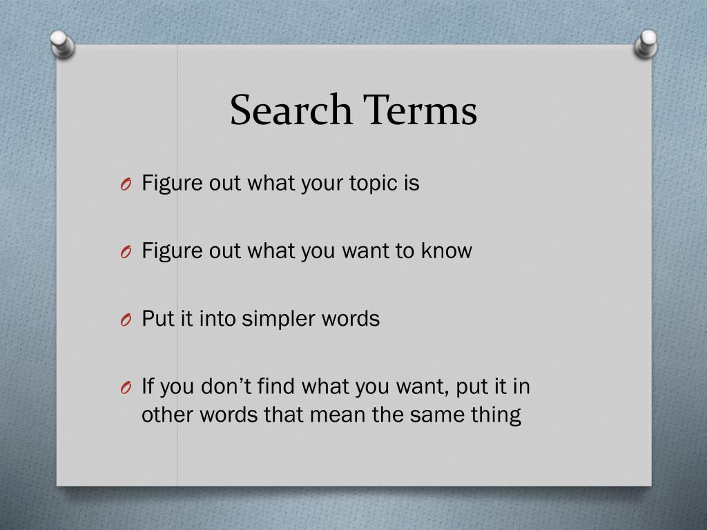 Search Terms • Figure out what your topic is • Figure out what you want to know • Put it into simpler words • If you don’t find what you want, put it in other words that mean the same thing