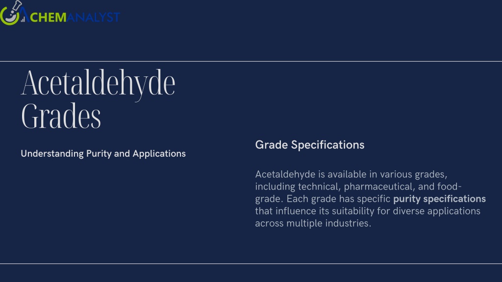 Acetaldehyde Grades Grade Specifications Understanding Purity and Applications Acetaldehyde is available in various grades, including technical, pharmaceutical, and food- grade. Each grade has specific purity specifications that influence its suitability for diverse applications across multiple industries.