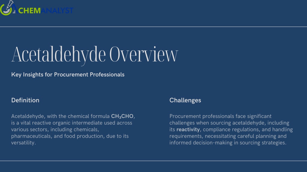 Acetaldehyde Overview Key Insights for Procurement Professionals Definition Challenges Acetaldehyde, with the chemical formula CH₃CHO, is a vital reactive organic intermediate used across various sectors, including chemicals, pharmaceuticals, and food production, due to its versatility. Procurement professionals face significant challenges when sourcing acetaldehyde, including its reactivity, compliance regulations, and handling requirements, necessitating careful planning and informed decision-making in sourcing strategies.