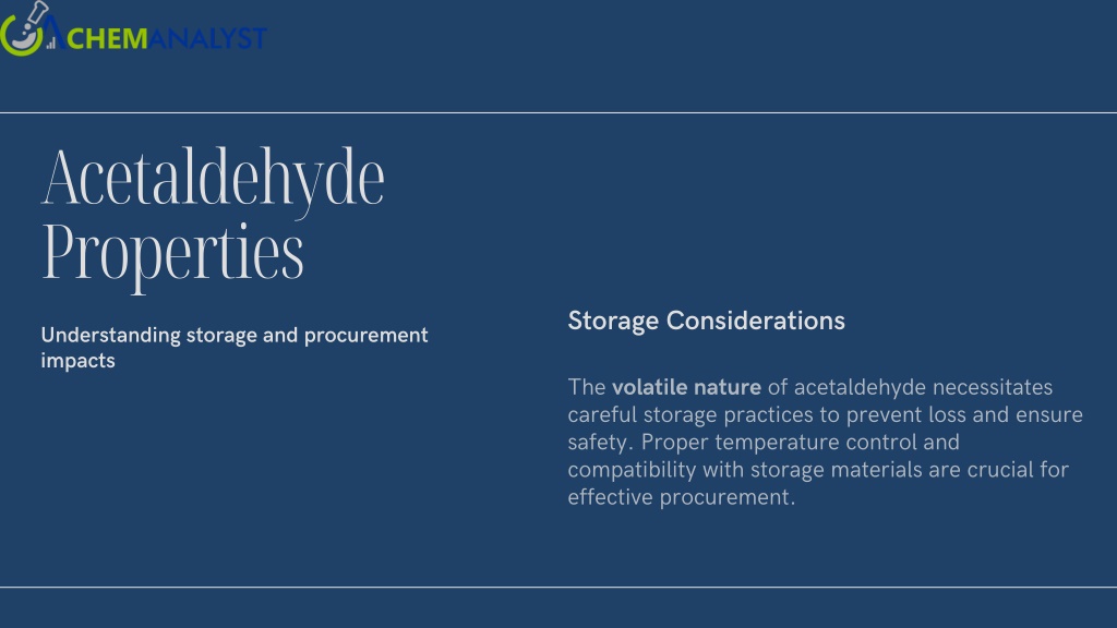 Acetaldehyde Properties Storage Considerations Understanding storage and procurement impacts The volatile nature of acetaldehyde necessitates careful storage practices to prevent loss and ensure safety. Proper temperature control and compatibility with storage materials are crucial for effective procurement.