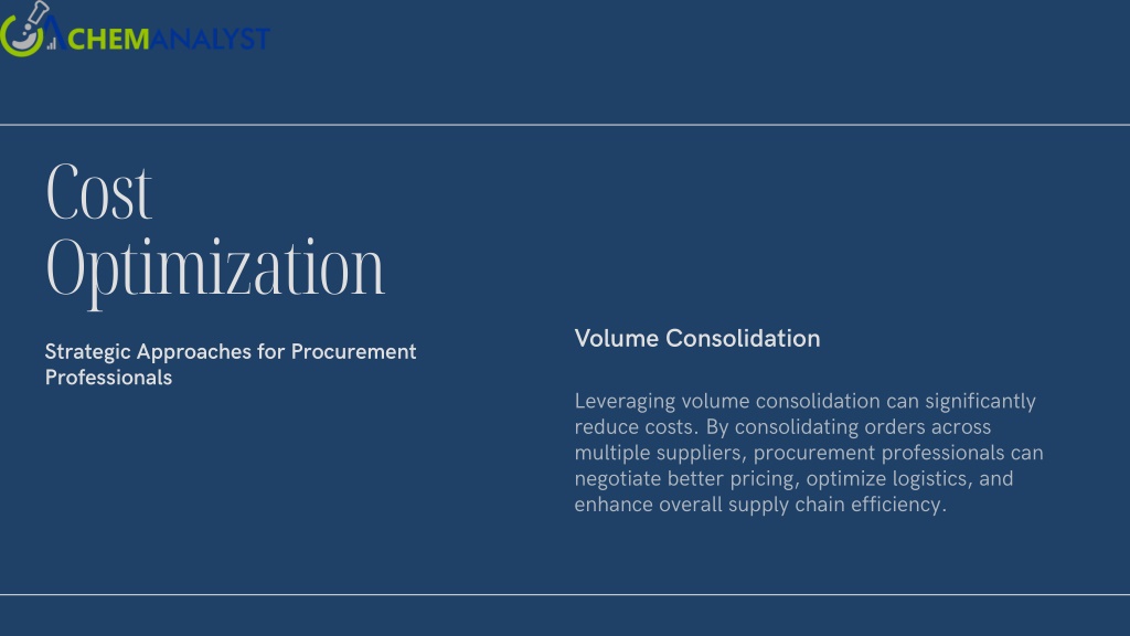 Cost Optimization Volume Consolidation Strategic Approaches for Procurement Professionals Leveraging volume consolidation can significantly reduce costs. By consolidating orders across multiple suppliers, procurement professionals can negotiate better pricing, optimize logistics, and enhance overall supply chain efficiency.