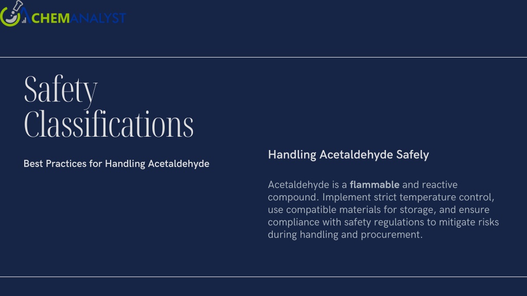 Safety Classifications Handling Acetaldehyde Safely Best Practices for Handling Acetaldehyde Acetaldehyde is a flammable and reactive compound. Implement strict temperature control, use compatible materials for storage, and ensure compliance with safety regulations to mitigate risks during handling and procurement.