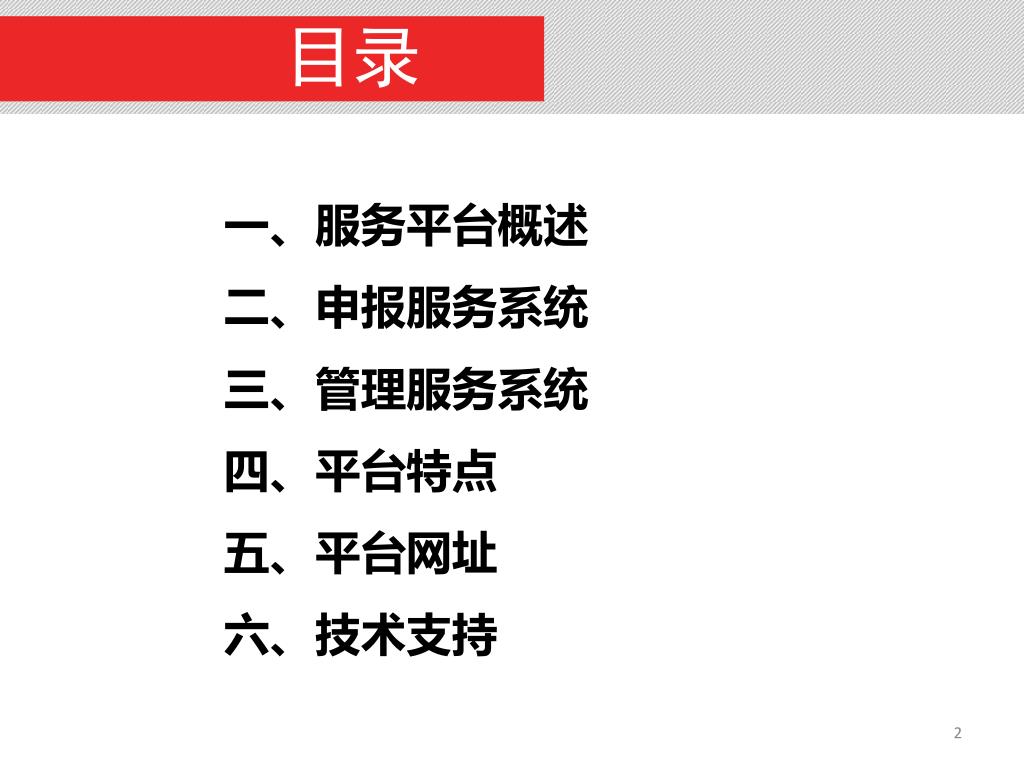 目录 一、服务平台概述 二、申报服务系统 三、管理服务系统 四、平台特点 五、平台网址 六、技术支持