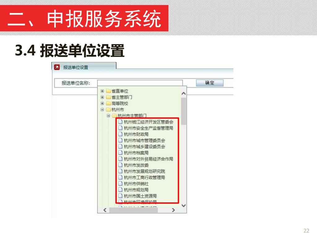 二、申报服务系统 3.4 报送单位设置 • 根据前边的申报流程类型,按“就近原则”选择审批单位。 • 审批单位可从下拉列表中选择。 • 如果列表中没有该单位,则表示该单位尚授予账号或不接收个人报送的材料。 • 材料报送错误可由该单位退回,并重新设置报送单位。 21