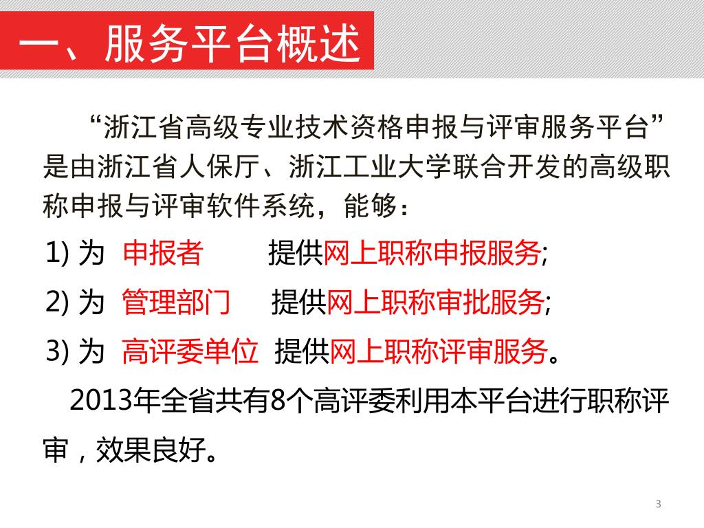 一、服务平台概述 “浙江省高级专业技术资格申报与评审服务平台”是由浙江省人保厅、浙江工业大学联合开发的高级职称申报与评审软件系统,能够: 1) 为 申报者 提供网上职称申报服务; 2) 为 管理部门 提供网上职称审批服务; 3) 为 高评委单位 提供网上职称评审服务。 2013年全省共有8个高评委利用本平台进行职称评审,效果良好。