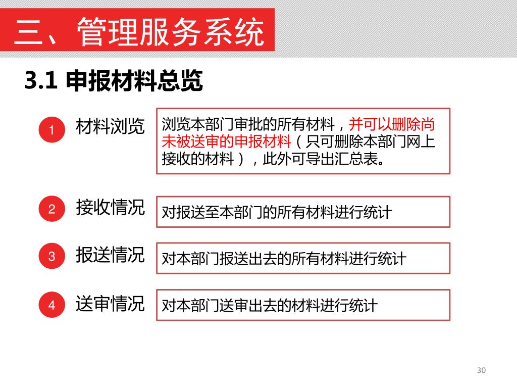 三、管理服务系统 3.1 申报材料总览 浏览本部门审批的所有材料,并可以删除尚未被送审的申报材料(只可删除本部门网上接收的材料),此外可导出汇总表。 材料浏览 1 接收情况 2 对报送至本部门的所有材料进行统计 报送情况 3 对本部门报送出去的所有材料进行统计 对本部门送审出去的材料进行统计 送审情况 4