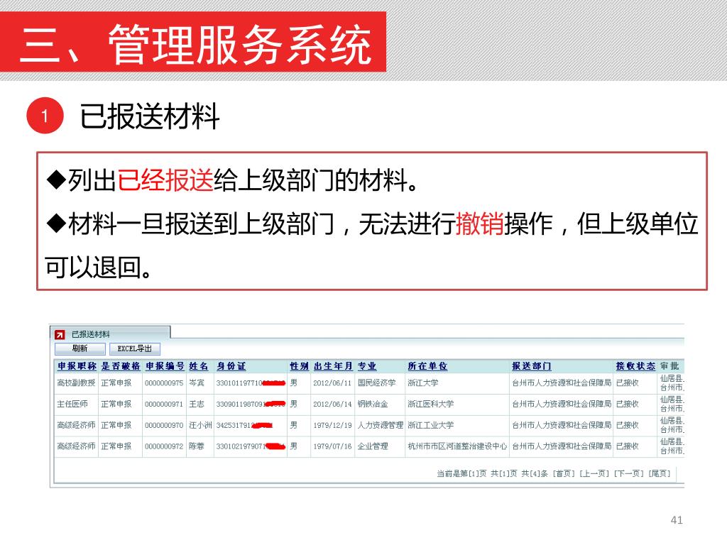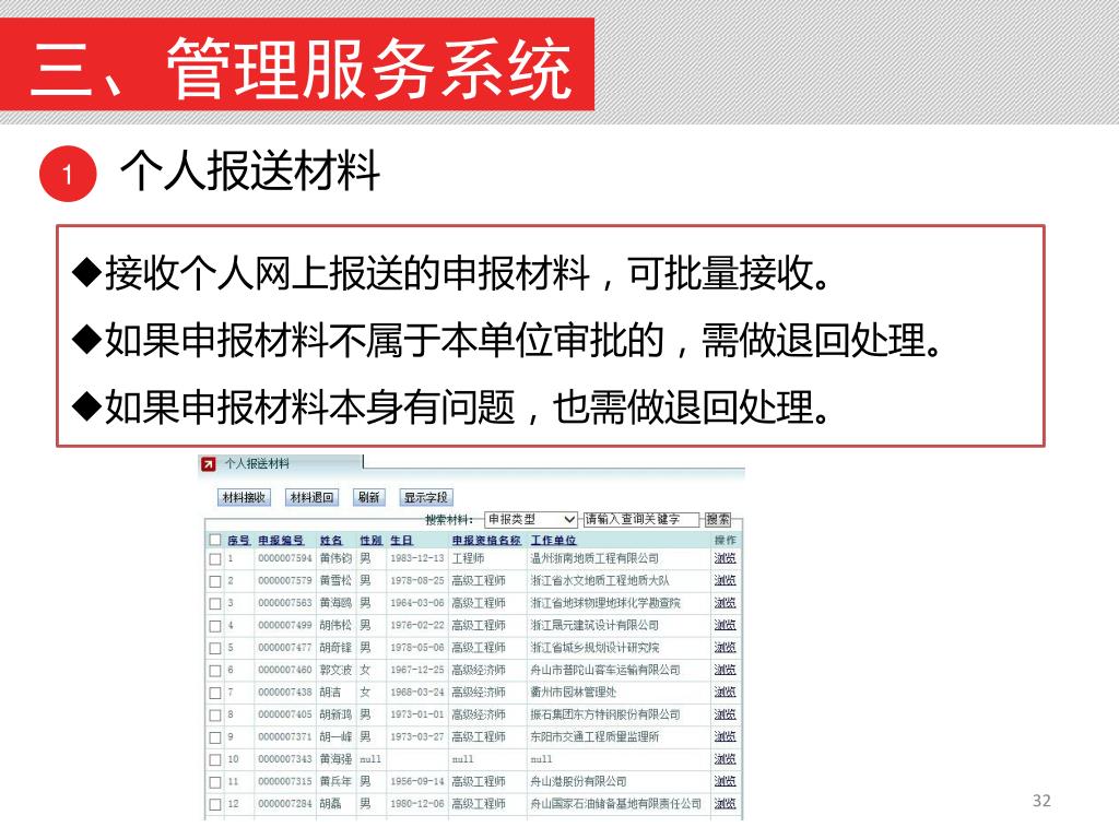 三、管理服务系统 个人报送材料 1 • 接收个人网上报送的申报材料,可批量接收。 • 如果申报材料不属于本单位审批的,需做退回处理。 • 如果申报材料本身有问题,也需做退回处理。