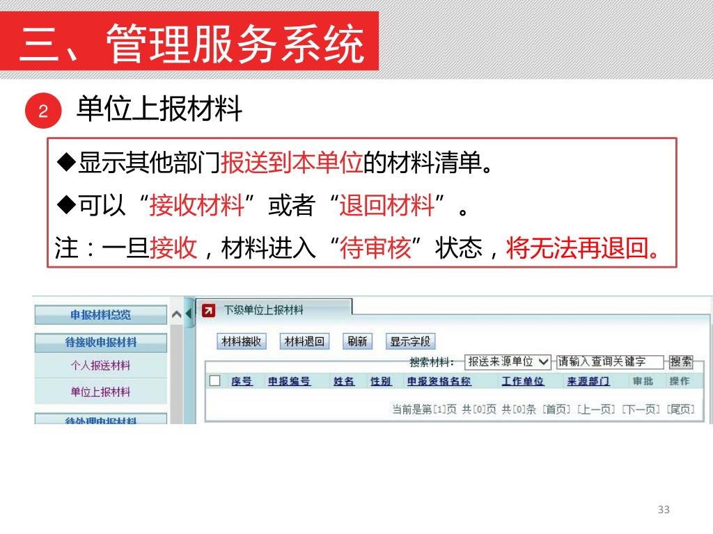 三、管理服务系统 单位上报材料 2 • 显示其他部门报送到本单位的材料清单。 • 可以“接收材料”或者“退回材料”。注:一旦接收,材料进入“待审核”状态,将无法再退回。
