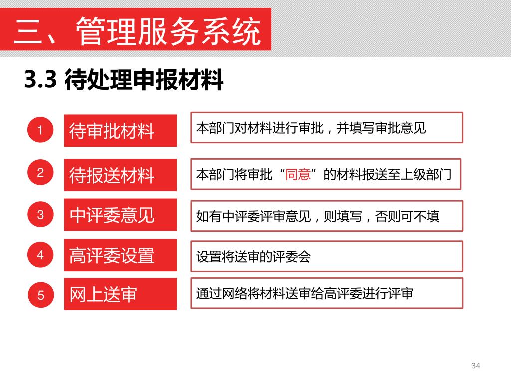 三、管理服务系统 3.3 待处理申报材料 本部门对材料进行审批,并填写审批意见 待审批材料 1 待报送材料 本部门将审批“同意”的材料报送至上级部门 2 中评委意见 如有中评委评审意见,则填写,否则可不填 3 高评委设置 设置将送审的评委会 4 网上送审 通过网络将材料送审给高评委进行评审 5