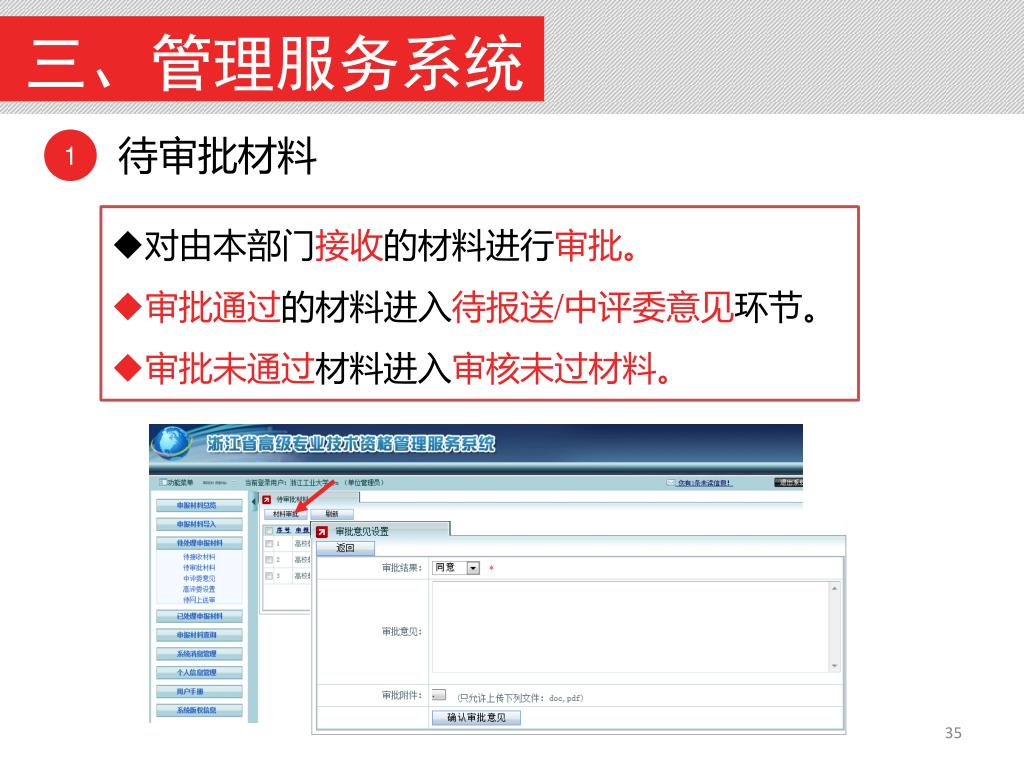 三、管理服务系统 待审批材料 1 • 对由本部门接收的材料进行审批。 • 审批通过的材料进入待报送/中评委意见环节。 • 审批未通过材料进入审核未过材料。