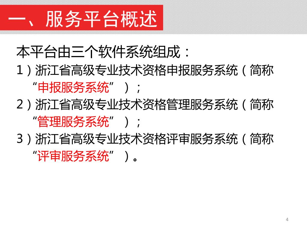 一、服务平台概述 本平台由三个软件系统组成: 1)浙江省高级专业技术资格申报服务系统(简称“申报服务系统”); 2)浙江省高级专业技术资格管理服务系统(简称“管理服务系统”); 3)浙江省高级专业技术资格评审服务系统(简称“评审服务系统”)。