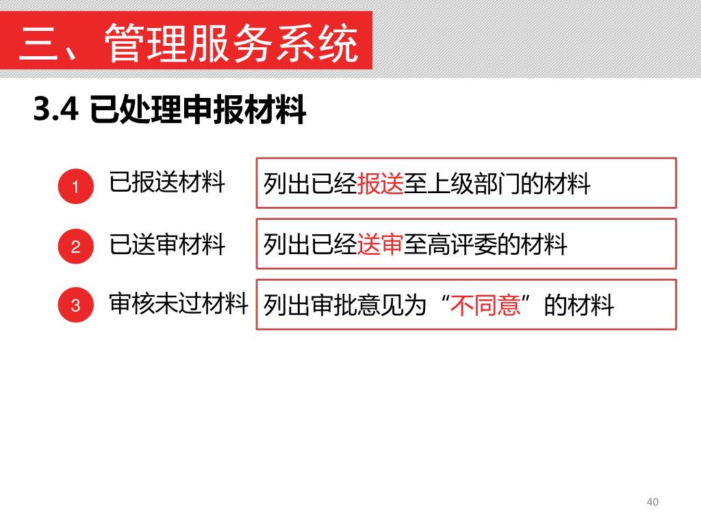 三、管理服务系统 3.4 已处理申报材料 列出已经报送至上级部门的材料 已报送材料 1 列出已经送审至高评委的材料 已送审材料 2 列出审批意见为“不同意”的材料 审核未过材料 3