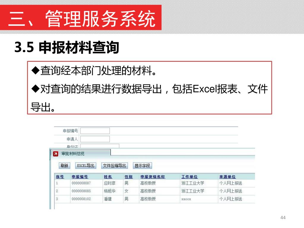 三、管理服务系统 3.5 申报材料查询 • 查询经本部门处理的材料。 • 对查询的结果进行数据导出,包括Excel报表、文件导出。
