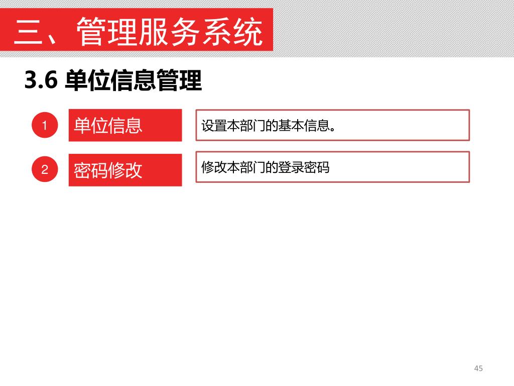 三、管理服务系统 3.6 单位信息管理 单位信息 设置本部门的基本信息。 1 修改本部门的登录密码 密码修改 2