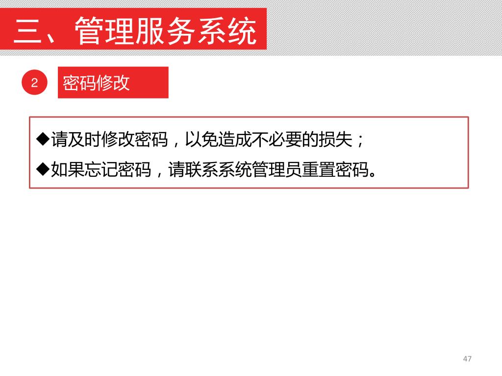 三、管理服务系统 密码修改 2 • 请及时修改密码,以免造成不必要的损失; • 如果忘记密码,请联系系统管理员重置密码。
