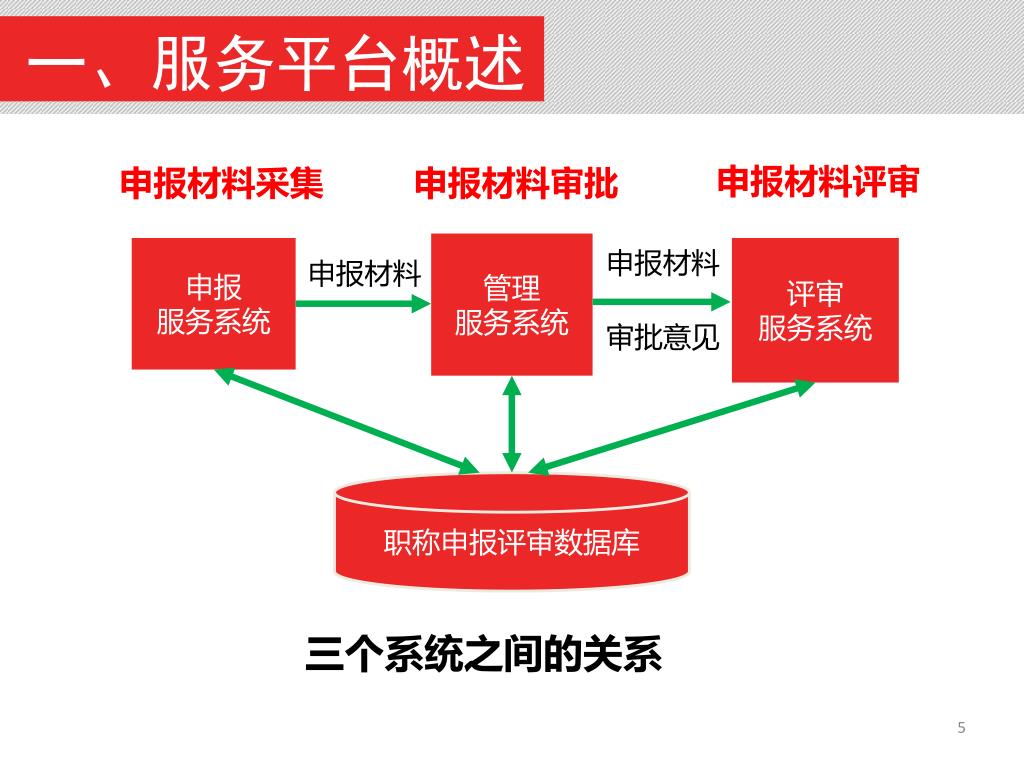 一、服务平台概述 申报材料评审 申报材料采集 申报材料审批 申报材料 申报材料 管理 服务系统 申报 服务系统 评审 服务系统 审批意见 职称申报评审数据库 三个系统之间的关系
