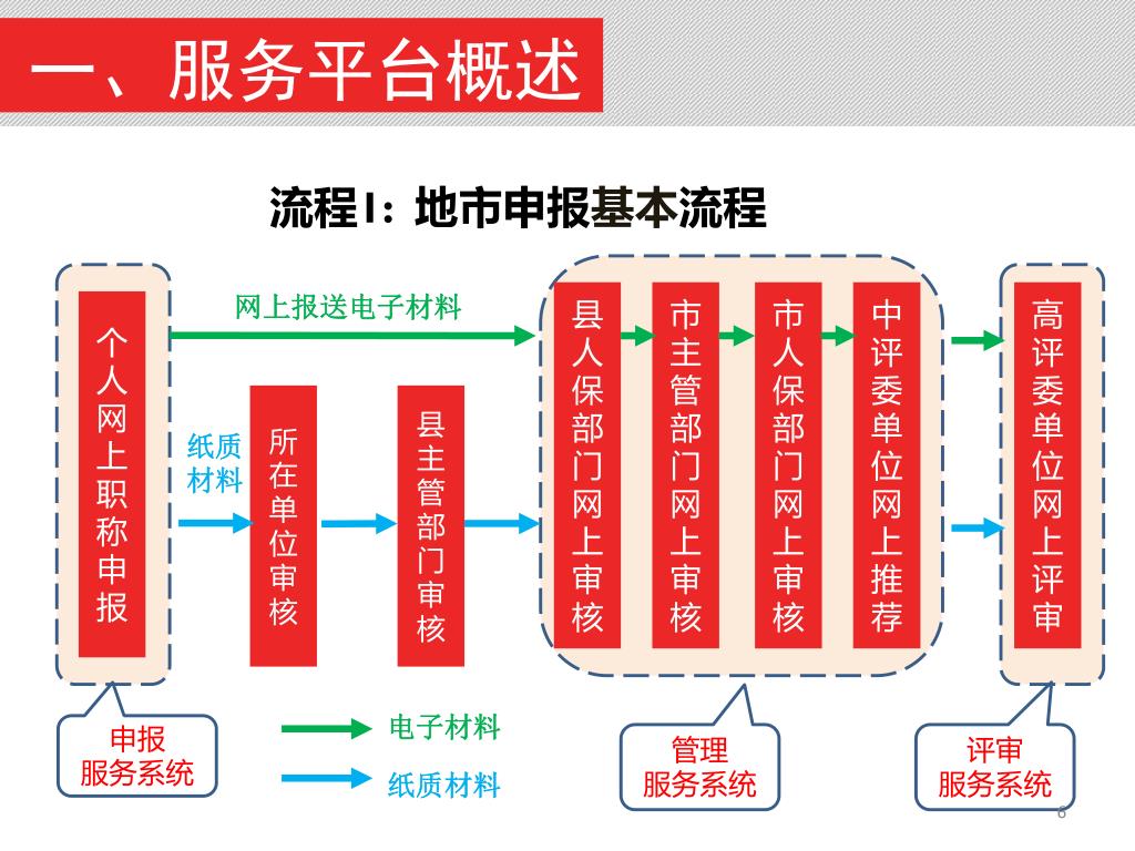 一、服务平台概述 流程II:省级单位申报基本流程 网上报送电子材料 个人网上职称申报 省主管部门 网上 审核 中评委 单位 网上推荐 高评委 单位网上 评审 所在 单位审核 纸质材料 电子材料 管理 服务系统 申报 服务系统 评审 服务系统 纸质材料