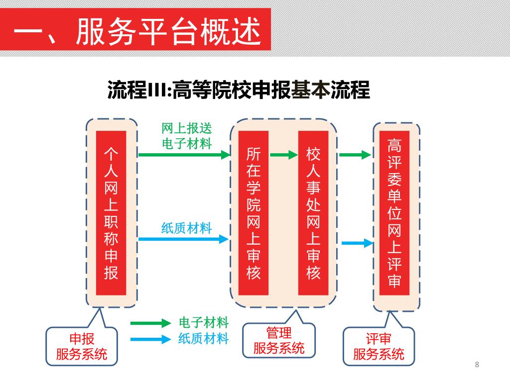 一、服务平台概述 流程III:高等院校申报基本流程 网上报送 电子材料 个人网上职称申报 所在学院网上审核 校人事处网上审核 高评委 单位网上 评审 纸质材料 电子材料 管理 服务系统 申报 服务系统 纸质材料 评审 服务系统