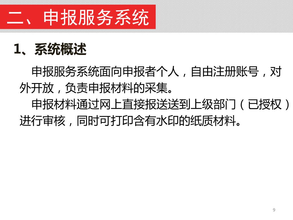二、申报服务系统 1、系统概述 申报服务系统面向申报者个人,自由注册账号,对外开放,负责申报材料的采集。 申报材料通过网上直接报送送到上级部门(已授权)进行审核,同时可打印含有水印的纸质材料。