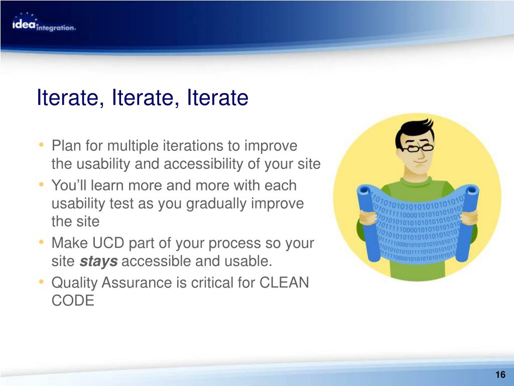 Iterate, Iterate, Iterate • Plan for multiple iterations to improve the usability and accessibility of your site • You’ll learn more and more with each usability test as you gradually improve the site • Make UCD part of your process so your site stays accessible and usable. • Quality Assurance is critical for CLEAN CODE