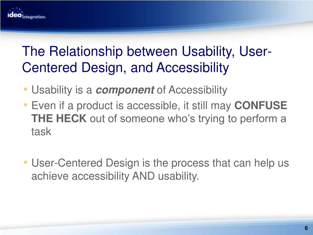 The Relationship between Usability, User-Centered Design, and Accessibility • Usability is a component of Accessibility • Even if a product is accessible, it still may CONFUSE THE HECK out of someone who’s trying to perform a task • User-Centered Design is the process that can help us achieve accessibility AND usability.
